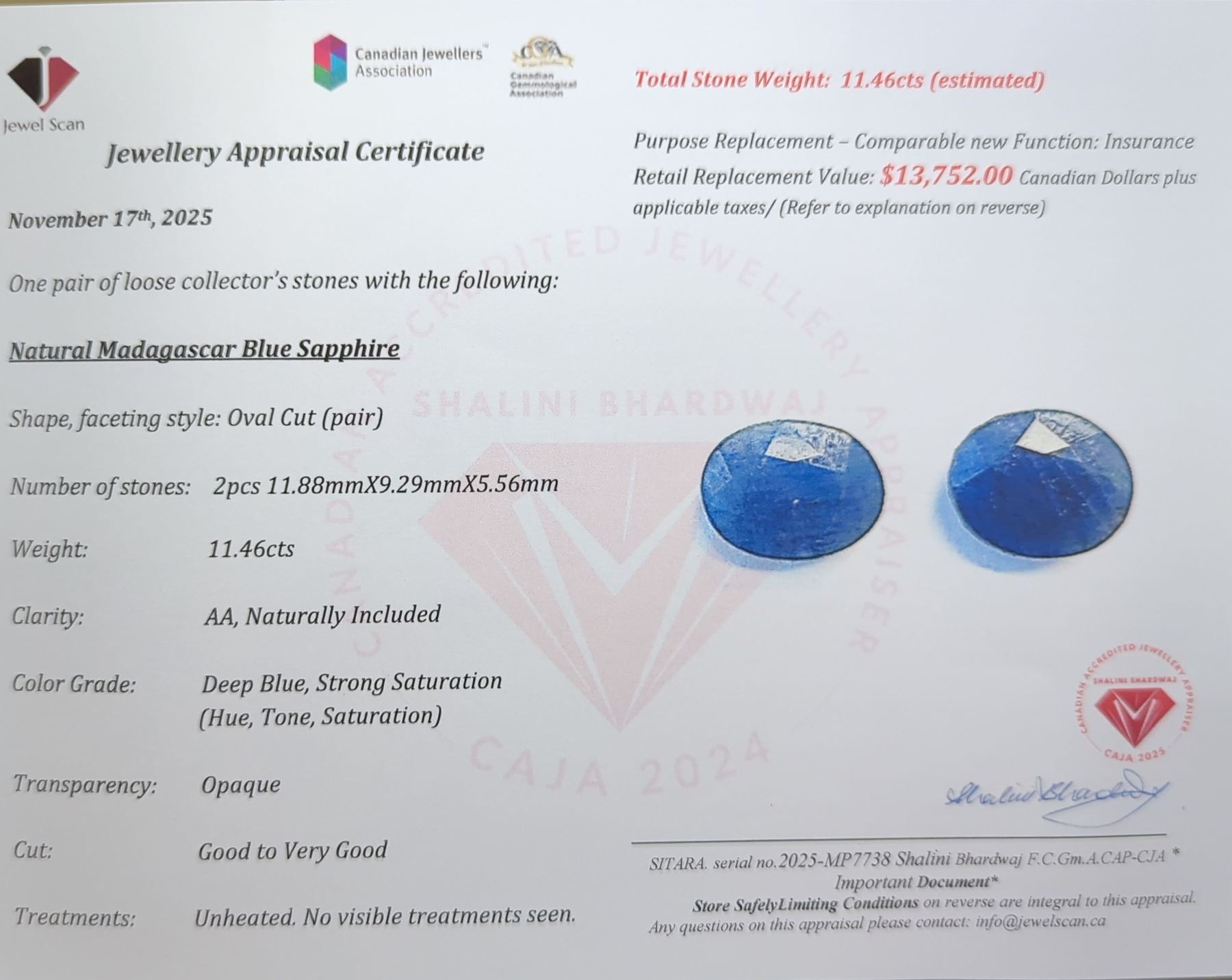 11.46 ct Certified Madagascar Sapphire gemstone Pair ($13,752 Appraisal)