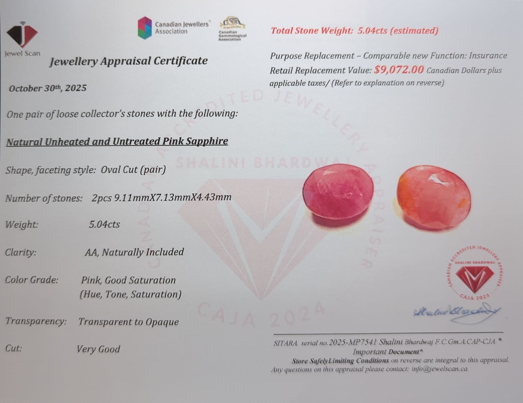 5.04 ct Certified Pink Sapphire gemstone Pair ($9,072 Appraisal)
