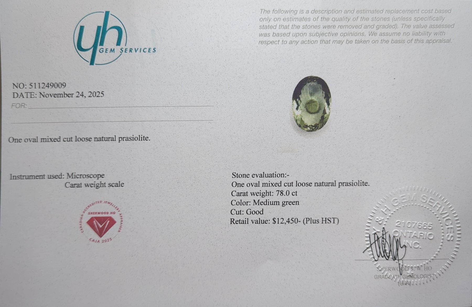 Lot 773B 78 ct Certified "Green Amethyst" Prasiolite gemstone ($12,450 Appraisal)