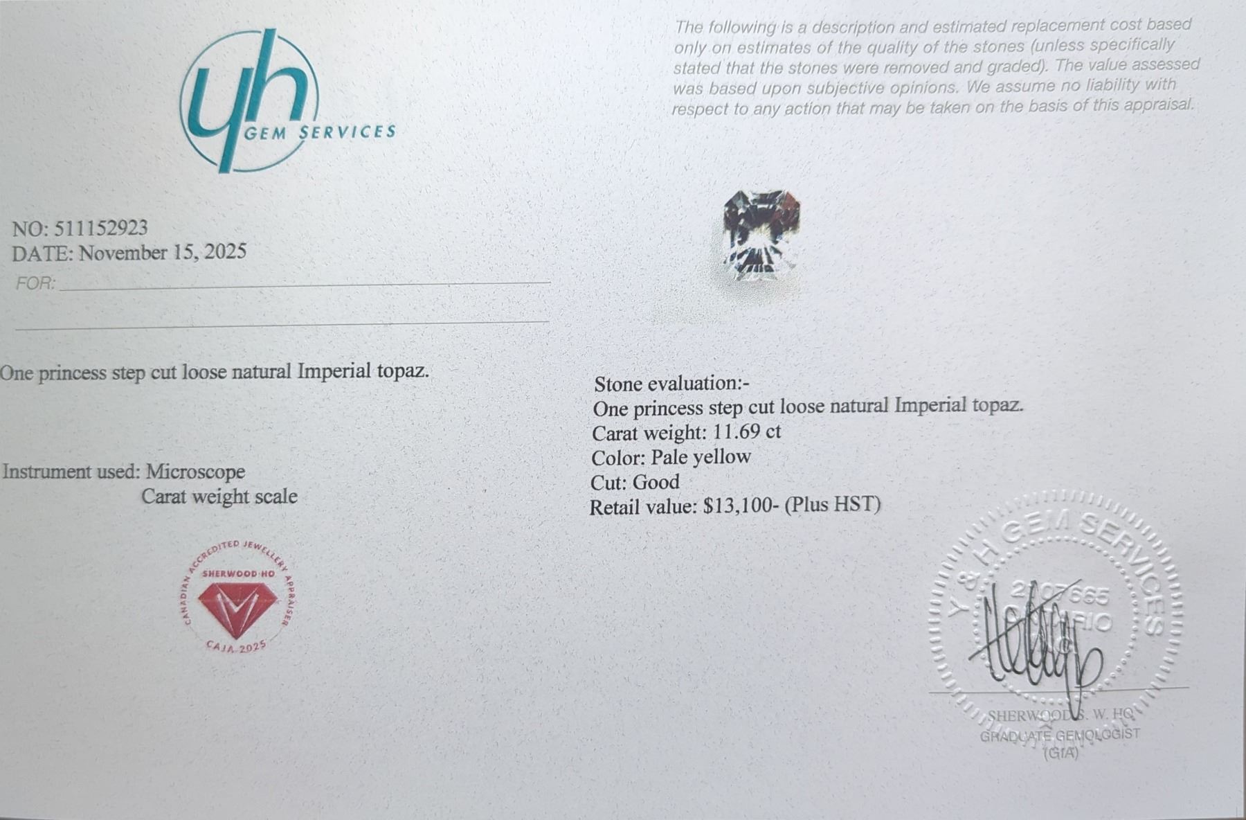 Lot 782B 11.69 ct Certified Imperial Topaz gemstone ($13,100 Appraisal)