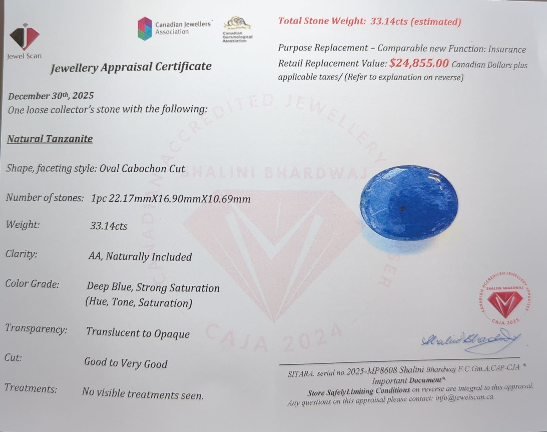 33.14 ct Certified Tanzanite gemstone ($24,855 Appraisal)