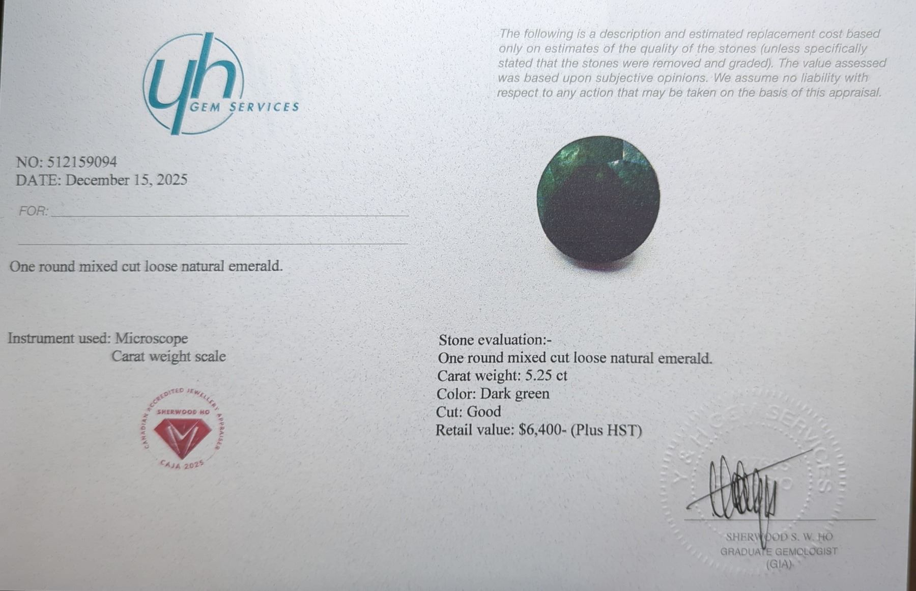 5.25 ct Certified Emerald gemstone ($6,400 Appraisal)